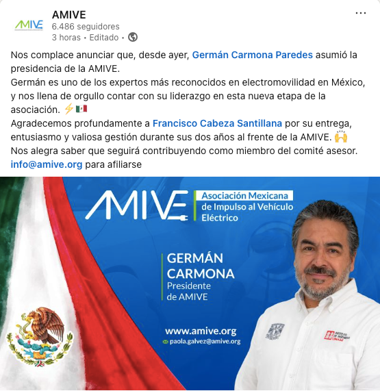La Asociación Mexicana para el Impulso al Vehículo Eléctrico (AMIVE) anunció el nombramiento de Germán Carmona Paredes, experto reconocido en el sector, y agradeció la gestión del presidente saliente, Francisco Cabeza Santillana.