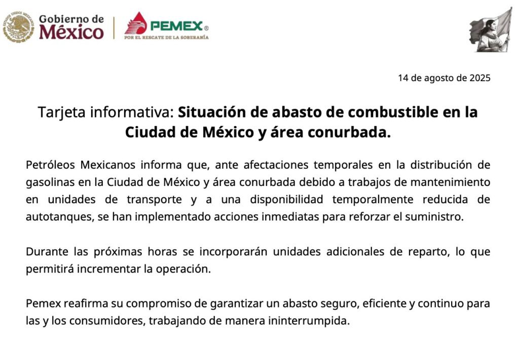 Ante los reportes de escasez de combustible y cierre de gasolineras en la Ciudad de México y su área conurbada, PEMEX ha emitido un comunicado oficial. La petrolera estatal afirmó que las afectaciones en la distribución son de carácter “temporal” y se deben a trabajos de mantenimiento en sus unidades de transporte, así como a una disponibilidad reducida de autotanques.