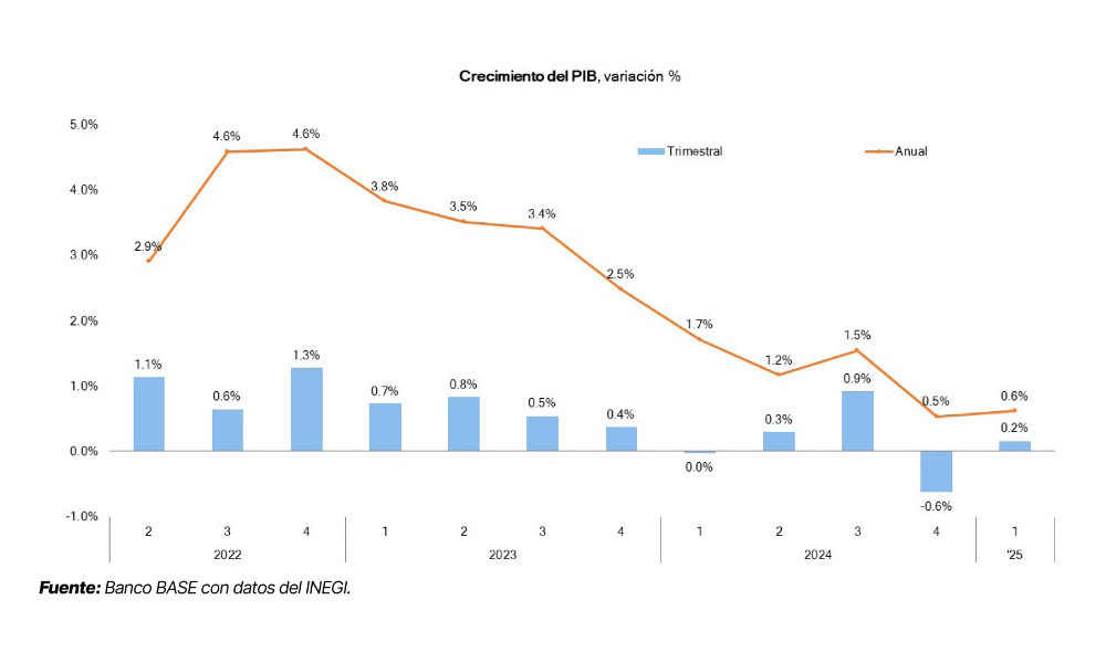 El PIB creció 0.2% en el primer trimestre del 2025, a tasa trimestral, luego de registrar una caída de 0.7% en el último trimestre del 2024, con esto se evitó una “recesión técnica” (figura 1). Por grupos de actividad económica, el crecimiento se concentró en las actividades agrícolas que aumentaron 7.8%. Mientras que las actividades industriales y de servicios disminuyeron 0.1%. El PIB muestra una clara tendencia a la baja desde el cuarto trimestre de 2022.