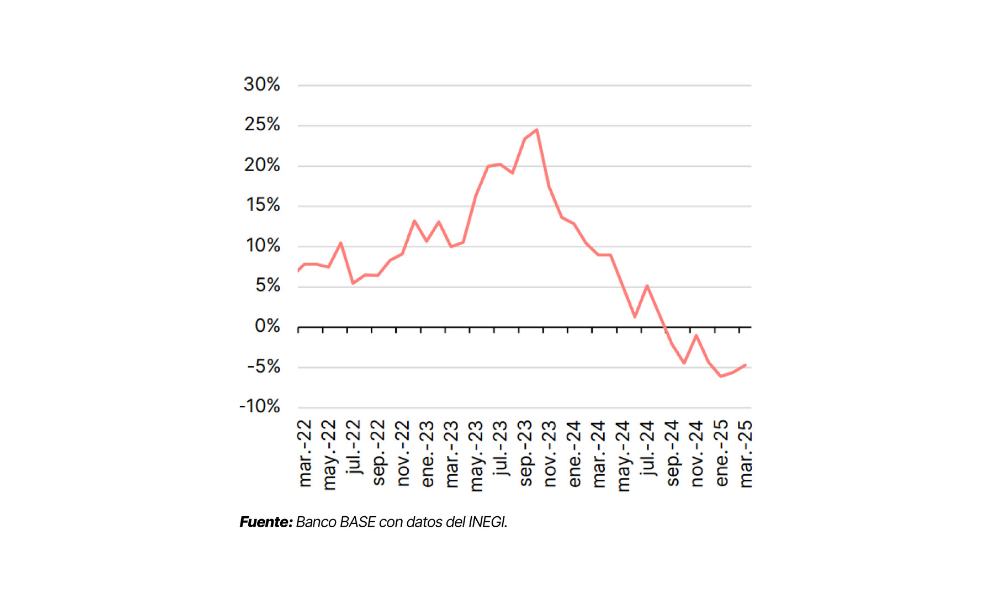 En lo relativo a la inversión, una de las variables económicas fundamentales para el crecimiento, el indicador registró en marzo un crecimiento de 0.28% respecto al mes anterior, con lo que acumuló dos meses consecutivos de avances mensuales, algo no visto desde el periodo abril-mayo del 2024. No obstante, a tasa anual se registró una contracción de 4.73%, marcando el séptimo mes consecutivo con caídas anuales (figura 2), algo no visto desde el periodo de noviembre 2018 a febrero del 2021, cuando México sufrió los efectos de la pandemia.