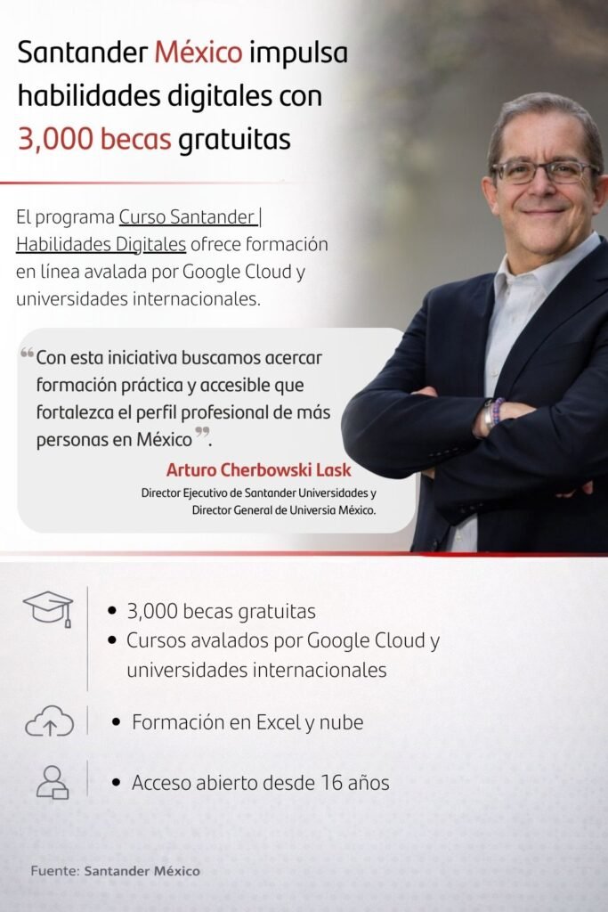 En un contexto donde la actualización de habilidades digitales se ha convertido en un factor clave para la competitividad laboral, Banco Santander México abre una convocatoria con 3,000 becas del programa Curso Santander | Habilidades Digitales, una iniciativa de formación gratuita en línea orientada a fortalecer competencias altamente demandadas por el mercado laboral.